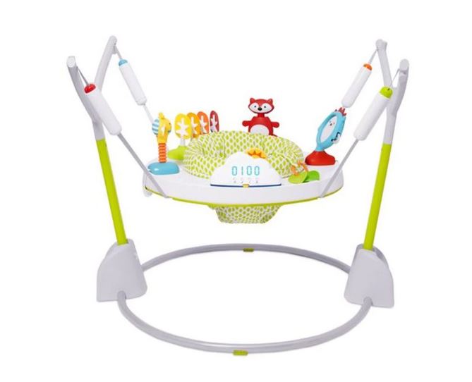 The Jumpscape Foldaway Jumper features a 360-degree rotating seat so your baby can sit, swivel and bounce for maximum exploration. It comes with clip-on, movable toys to stimulate your child's development. It has light-up cloud bounce counter to track baby's jumps, and the jumper rewards baby with lights and music and breaks into applause at 100-jump milestones. Cuteness overload! And, when playtime is done, easily fold the jumper flat for storage and transport